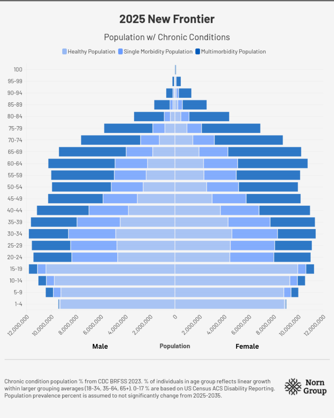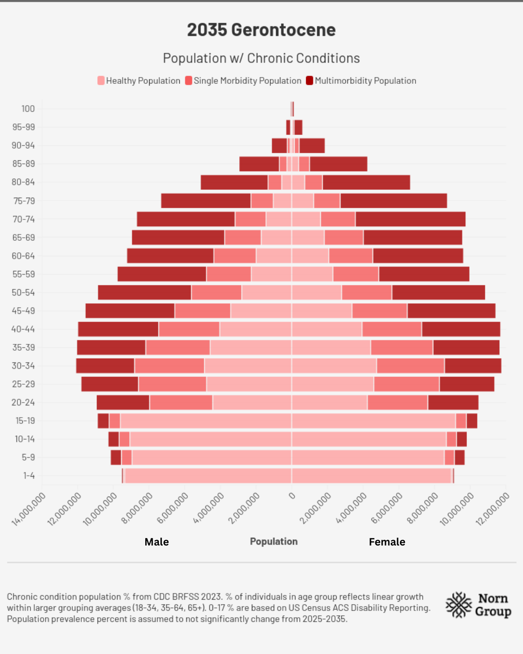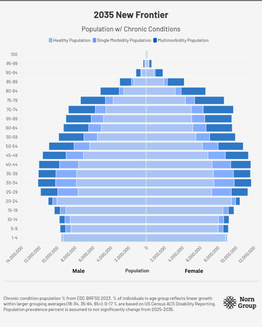 Assumptions for demographic charts: Total populations in each age range are from the U.S. Census Bureau’s International Database. Chronic condition population percentages come from CDC BRFSS 2023. The percent of individuals in each age group reflects linear growth within larger grouping averages for disease burden prevalence percentages (18-34, 35-64, 65+). Numbers for 0-17 are based on US Census ACS Disability Reporting, as no chronic disease data were available. Population prevalence percent is assumed not to change meaningfully from 2025-2035.