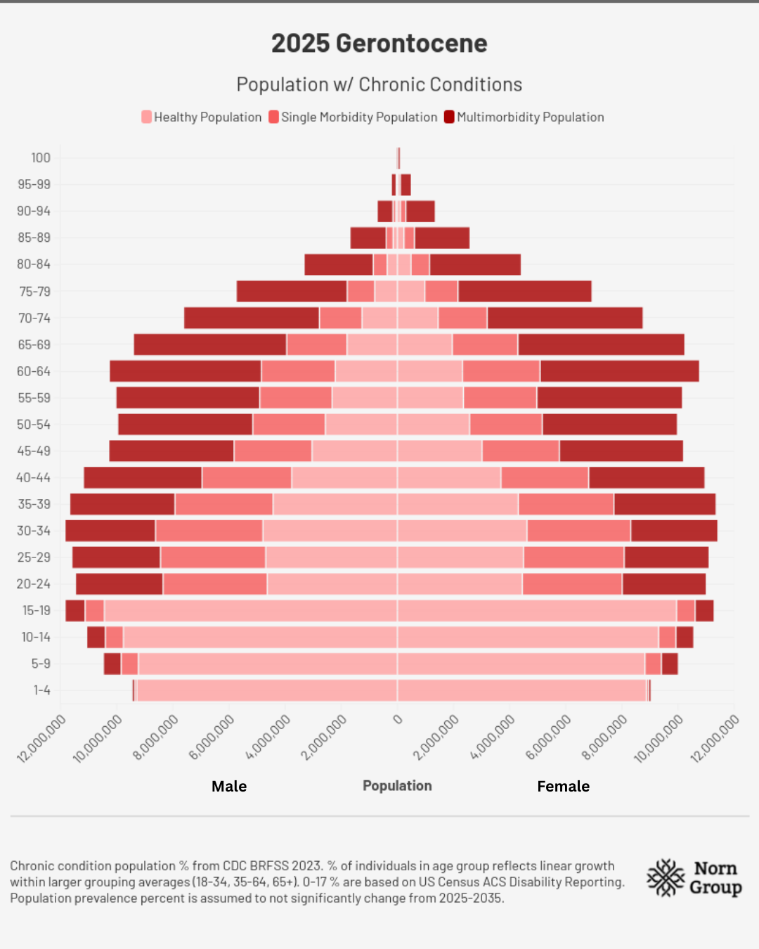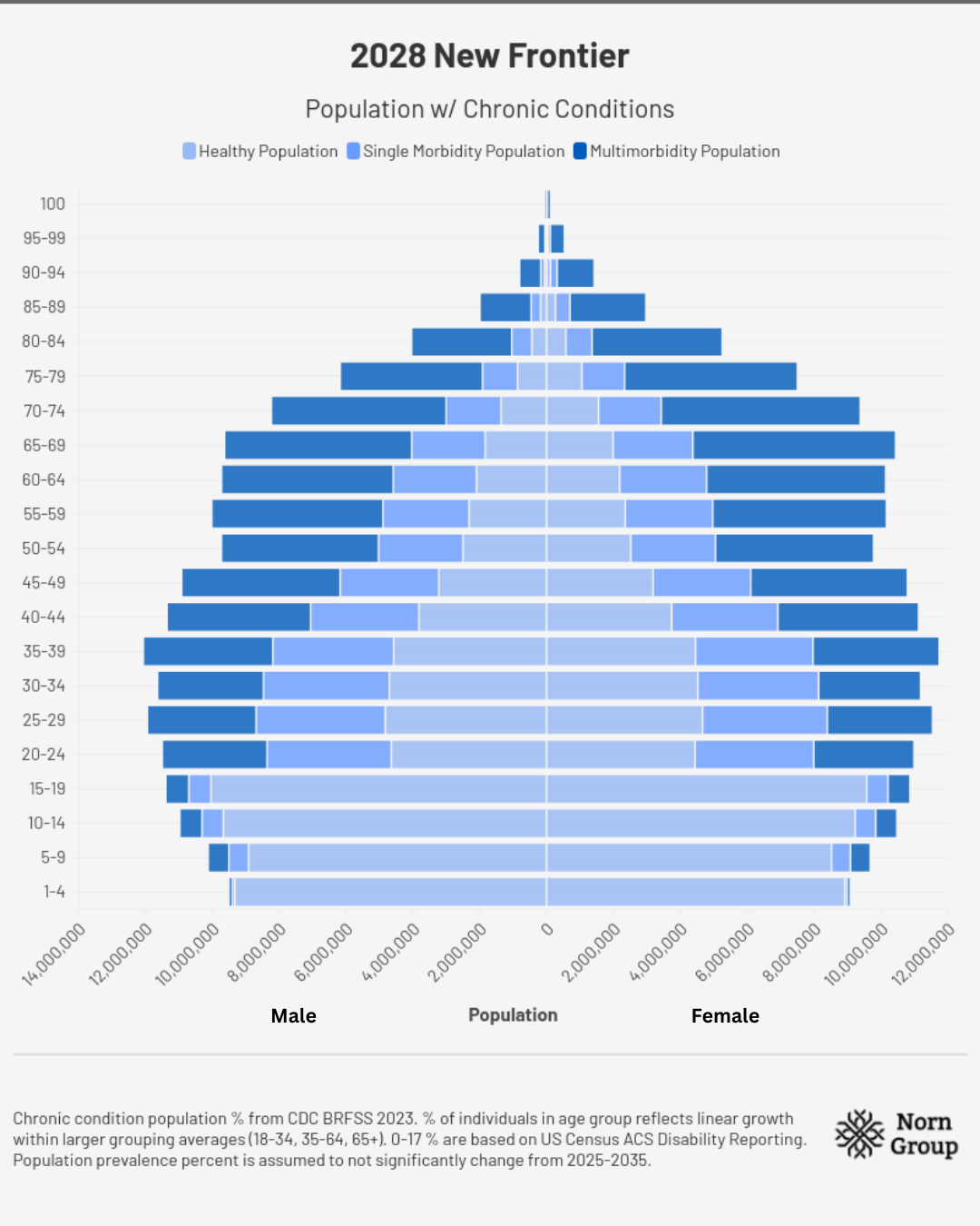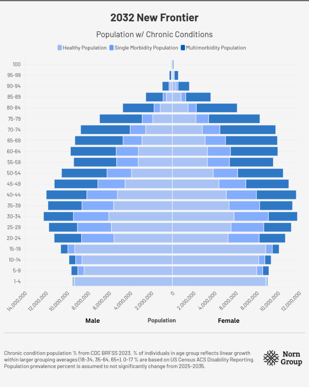 Assumptions for demographic charts: Total populations in each age range are from the U.S. Census Bureau’s International Database. Chronic condition population percentages come from CDC BRFSS 2023. The percent of individuals in each age group reflects linear growth within larger grouping averages for disease burden prevalence percentages (18-34, 35-64, 65+). Numbers for 0-17 are based on US Census ACS Disability Reporting, as no chronic disease data were available. Population prevalence percent is assumed not to change meaningfully from 2025-2035.