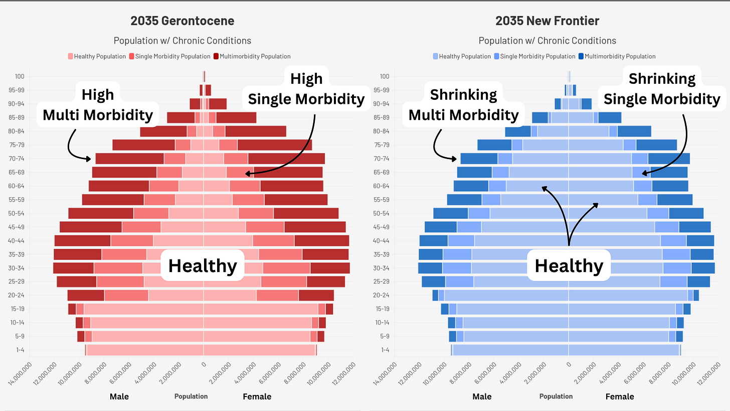 Assumptions for impact of new therapeutics: We assume that the percent prevalence of disease is the same for both tracks until 2032 (for example, if multiple chronic condition burden for 65+ is reported by BRFSS is 78%, it is assumed to be 78% in both the Gerontocene and the New Frontier). For the reduction of disease burden starting in the 2032 entry, we assume a 15% reduction in chronic disease prevalence and then a 30% reduction in 2035. These estimates are based on one, then two, medicines from aging research with effects comparable to existing GLP1 agonists (such as Ozempic), roughly 20% on multiple prevalent diseases. We do not attempt to model specific efficacy on individual conditions. These reduction figures do not factor in any form of adoption percentage, discount rate, or other distribution metric.