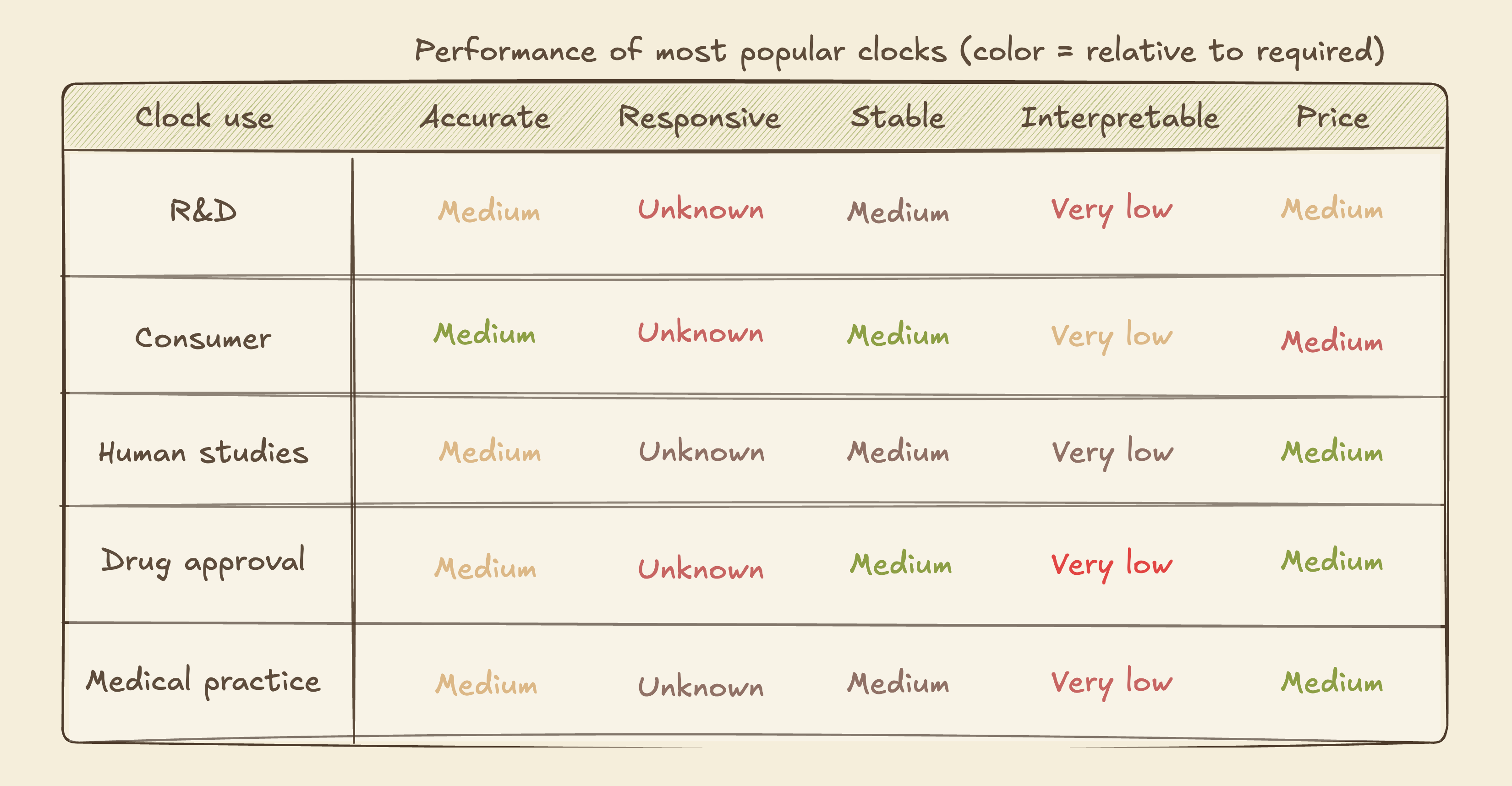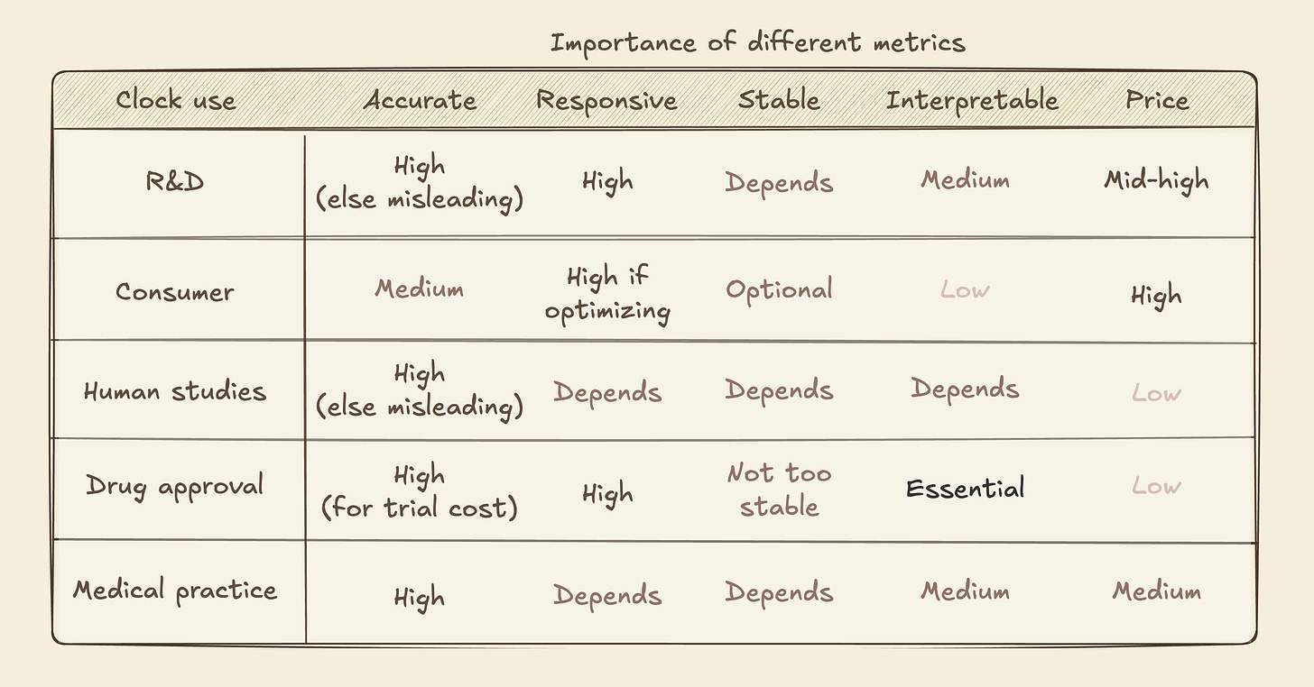 Interpretability: Do we know the physical/biological reality that the clock is measuring, or is it a black box? If not, it’ll be hard to convert answers to actions.