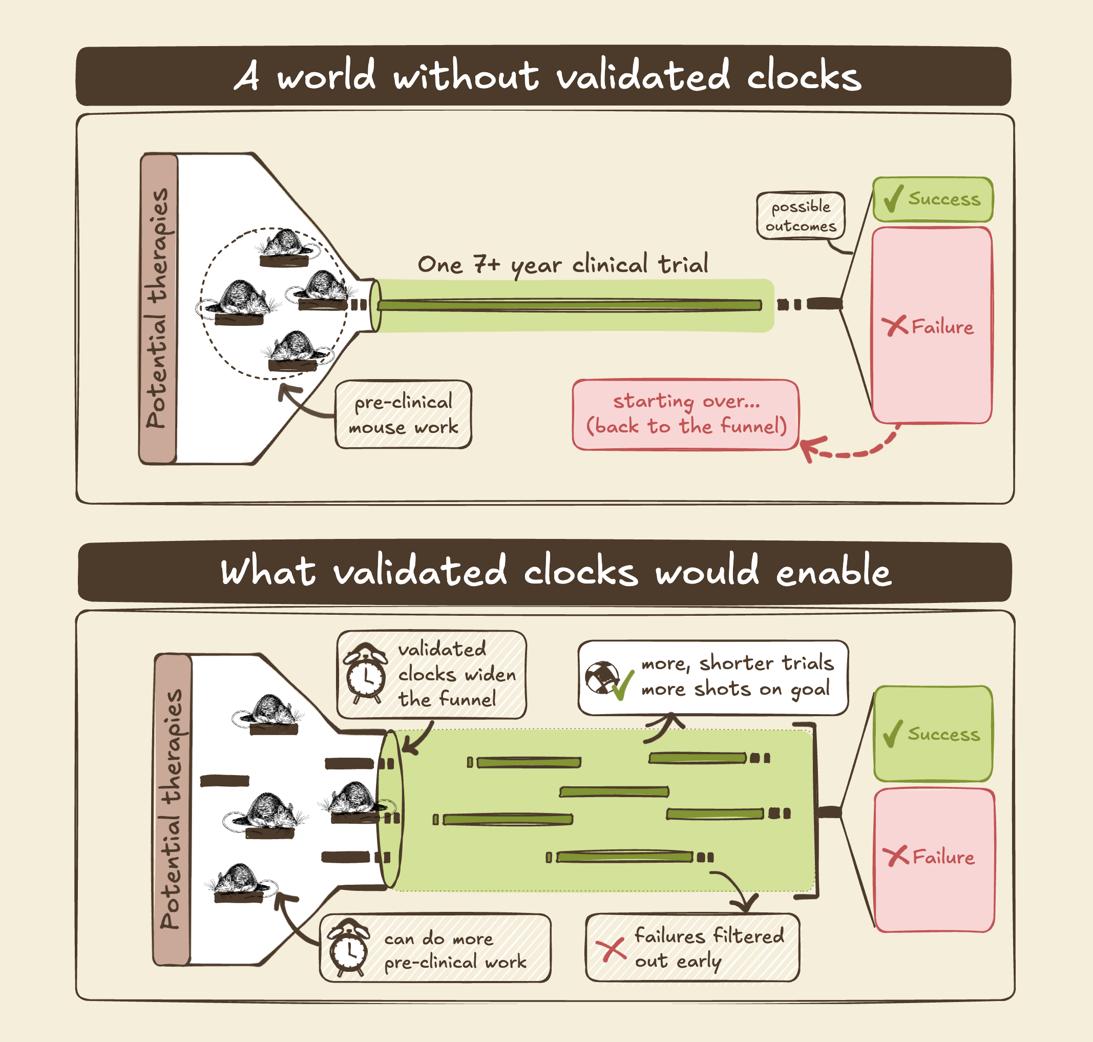 13 years after the first 'aging clock' was published we're still measuring mouse lifespan and unable to run human aging trials. What's missing?