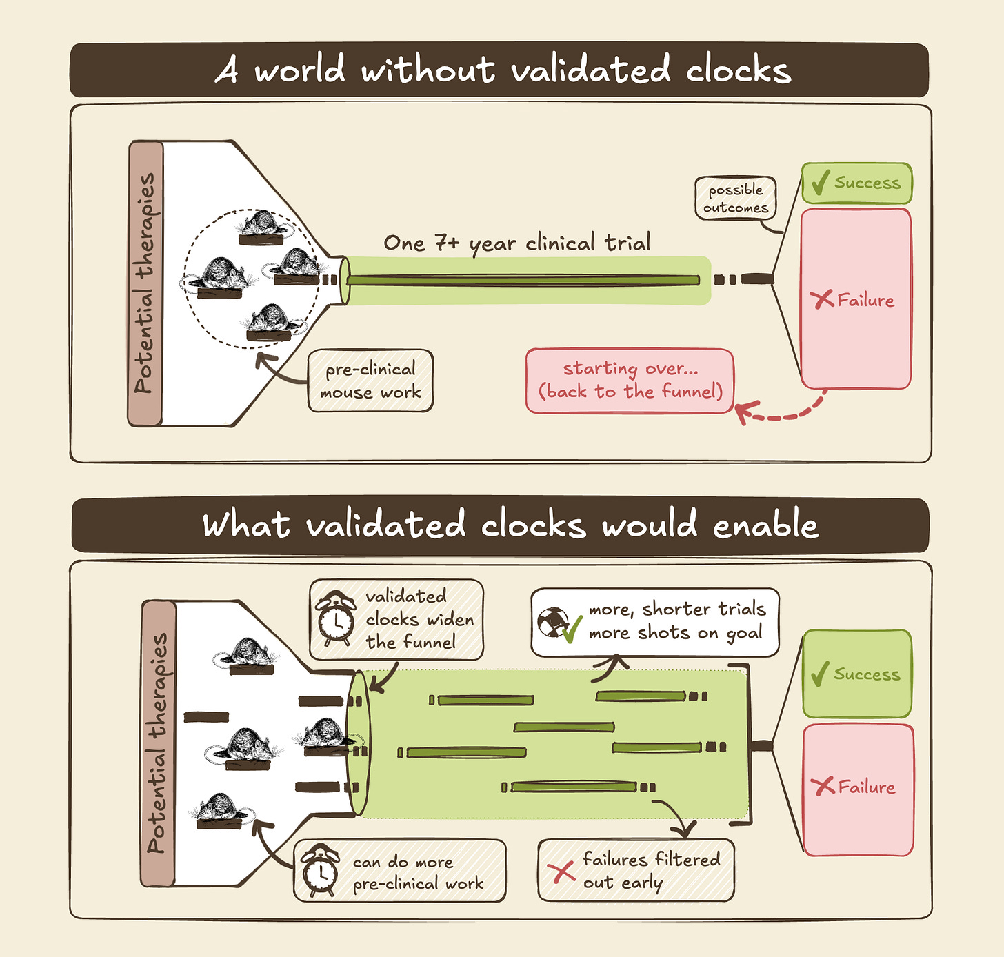 And on top of this, decreasing costs and delays increases momentum for the field: There are many unanswered questions in longevity, like whether a single treatment can reduce biological age across the body or whether we need combinations of treatments, how to design trials with the best signal per cost, and how to dose and deliver different treatments. We won’t have answers to most of these until we try potential solutions and find out what we’re missing. Faster and cheaper iterations means we can put down more puzzle pieces faster, as things get filled in it becomes easier to solve the next piece. So validated biomarkers/clocks will increase not only the rate of progress in longevity, but also the rate of acceleration.