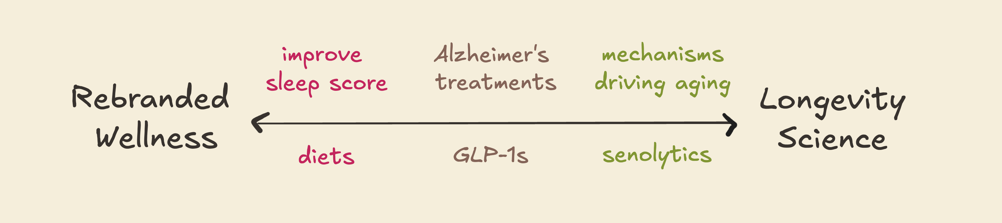 And at the left end you have rebranded wellness. Sleep well, exercise, don’t smoke, eat vegetables. All true, all useful, but nothing new. People knew it a year ago, ten years ago, a hundred years ago. It exists independently of any longevity research. Follow it perfectly and you’re optimizing for a healthy 78, not a possible 120. There’s nothing wrong with that, but it’s not what the longevity field is actually trying to do.