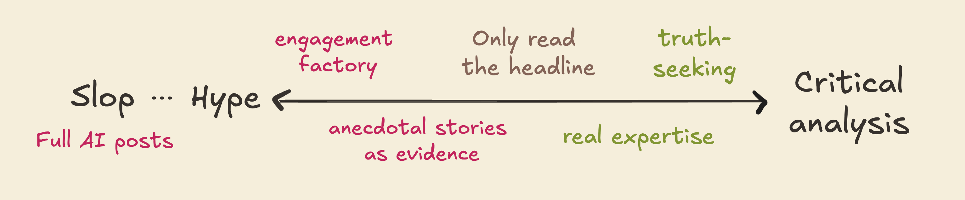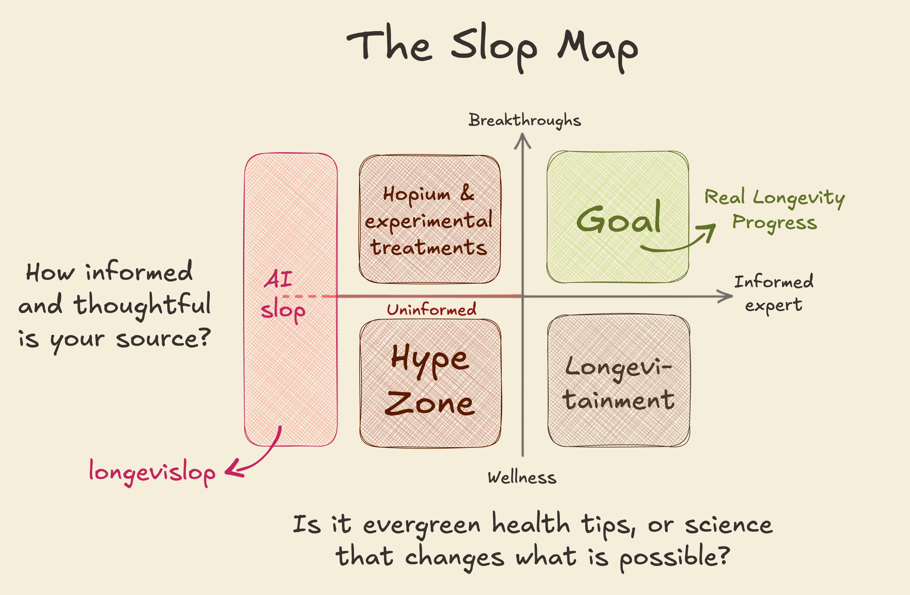 Love the slop map framework. The rebranded wellness quadrant is especially spot-on, it's wild how much "longevity" content is just decade-old advice with a shiny new label. What I find trickiest tho is the uncritical longevity zone, where hype mixes with real but early-stage science. Seen this when following NAD+ boosters back in 2018, tons of enthusiasm but the actual human trials lagged way behind the claims. The checklist at the end is gold, especially asking "what would normally happen next" and actually checking back.