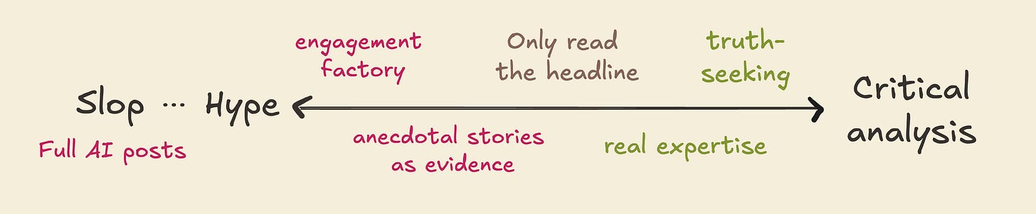 On one end, you have informed sources who think deeply about their topic. These are people who have done the work to digest news and progress, who understand context and relevant events from the past, and who are clear about what do and don’t know. They are genuinely truth-seeking, and bringing you along for the ride. If you asked them a harder question, they could answer it thoughtfully. Following people like this is an amazing way to learn, because they compress hours and years of learning into useful updates on the world. Let’s give them an award: