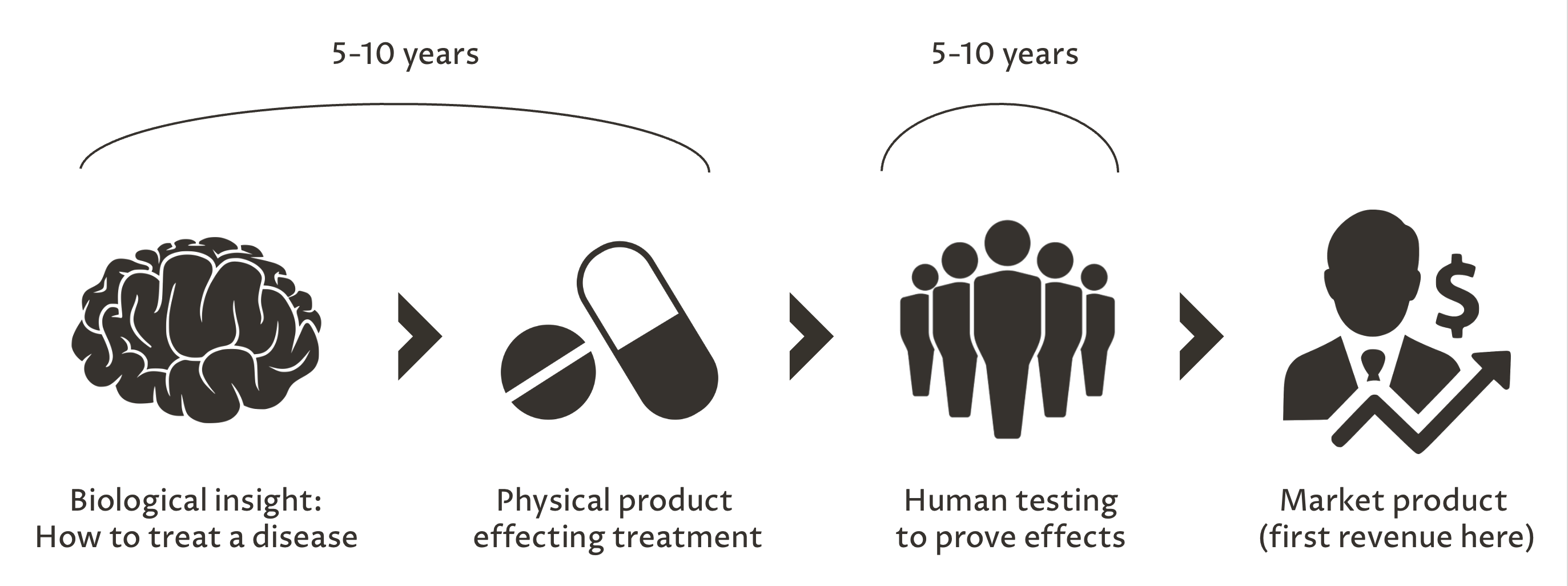This phenomenon occurs because 1) once clinical trials are launched the product and design are locked in by FDA filings, and cannot benefit from new insights or improvements, and 2) successful clinical trials reward successful early discovery and drug development, but not until many years after the work is done. So the stages of value creation and capture are de facto decoupled, and unable to form a flywheel.