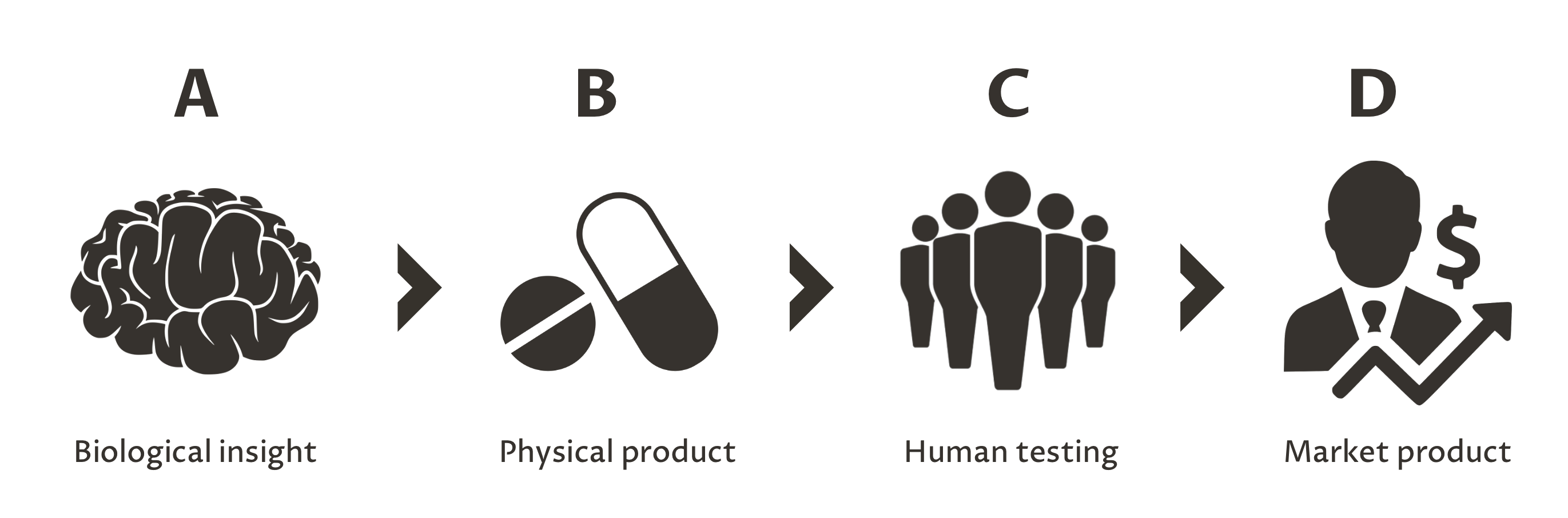 A technology that creates a flywheel at just stage B (for example new way to target genes, like Alnylam) could outperform within status quo, but will be no more likely than average to generate a second success.