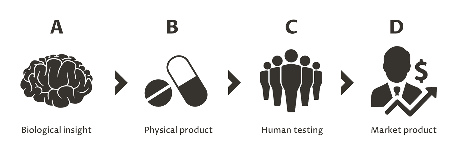 Similar problems can occur in other industries. For example, you know you want a user to get the search results they care most about, but not how. Or you’re building an engine before you have a spaceship to launch. But in general it is much easier to work up an idea and get direct feedback on whether it is good: write and run the code quickly, or test the engine on the ground. Biotech only gets incontestible feedback from human testing. This is akin to not being allowed to test your rocket engine before the final launch [1].